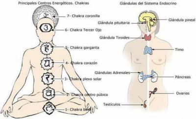 Chakra significa rueda o vórtice. Todos contamos con siete chakras principales o centros de energía.que manifiestan nuestro estado de conciencia. Cada uno de los chakras está asociado a una de las glándulas endócrinas y a un grupo de nervios llamado plexo. De este modo cada chakra se asocia a partes y funciones concretas del cuerpo. Todos los chakras se relacionan entre sí formando otro gran vórtice de energía llamado aura. El aura es el campo magnético que rodea a nuestro cuerpo entero. La apertura de nuestros chakras se relaciona con nuestras percepiones,sentimientos y decisiones. Al abrir nuestros chakras durante las sesiones de Reiki, éstos se equilibran , se despiertan nuestros sentidos y este proceso nos abre al gran campo de energía original.